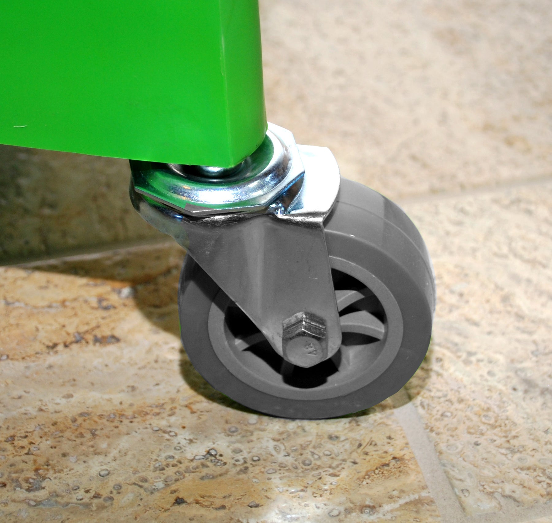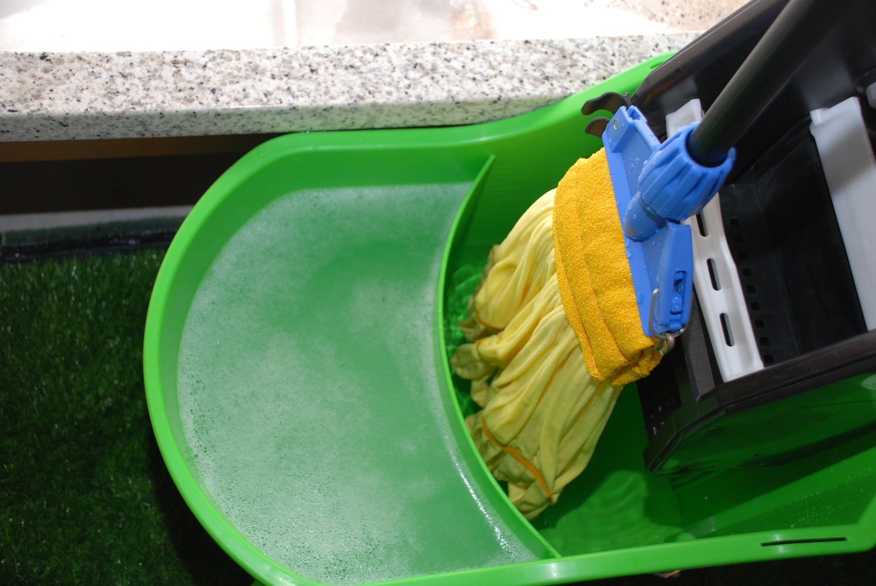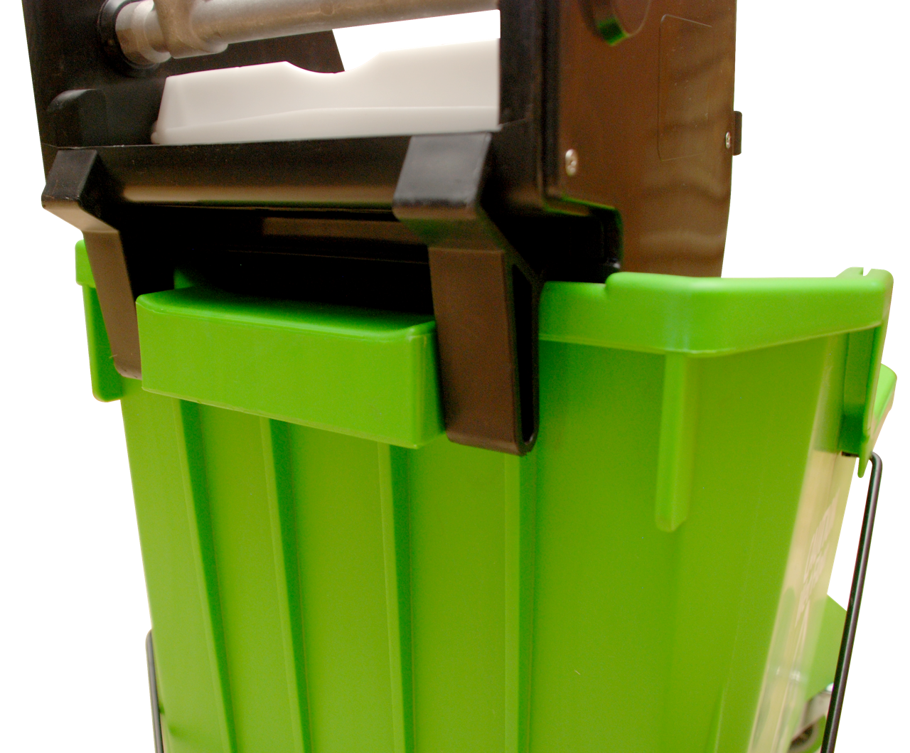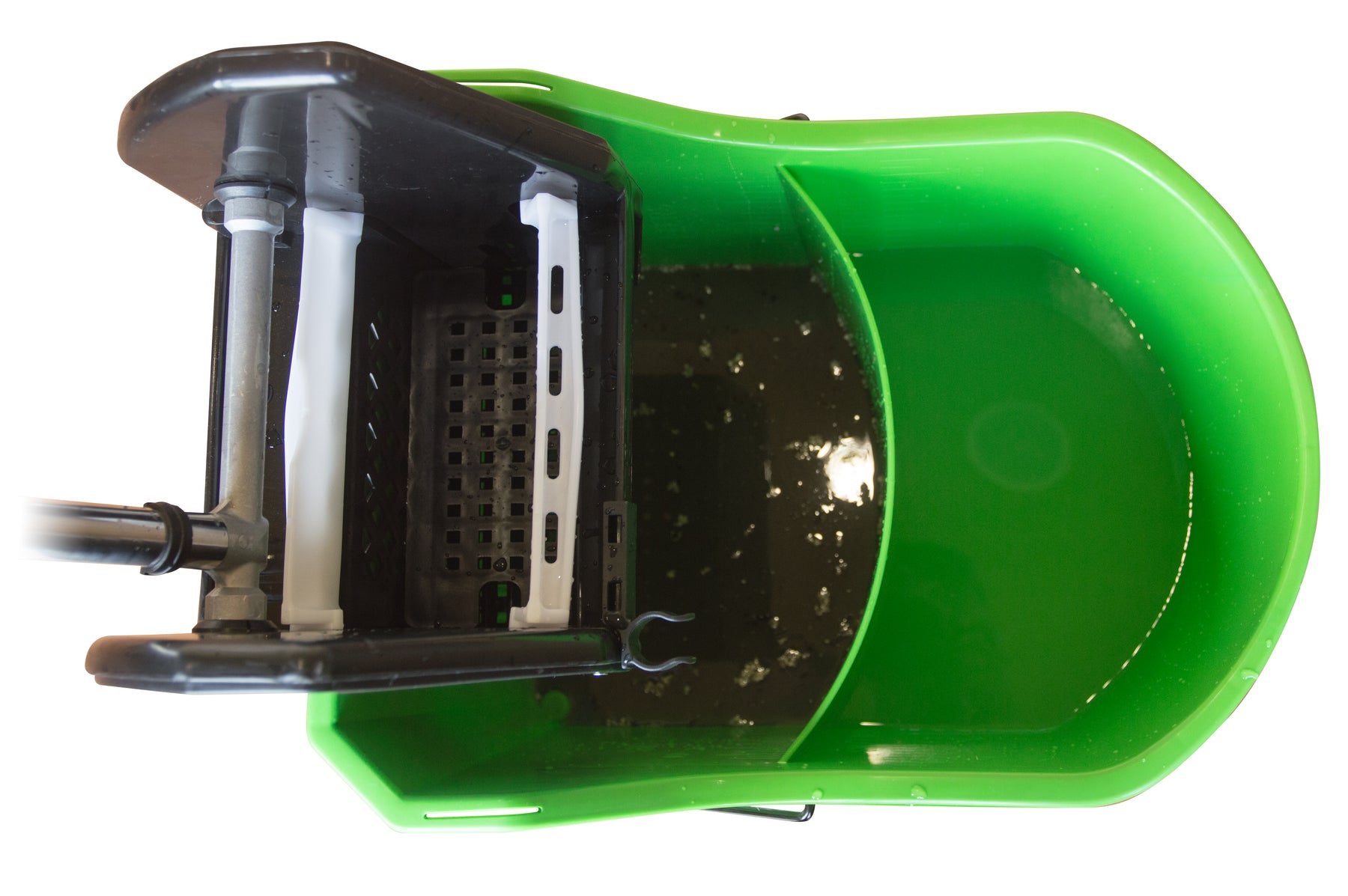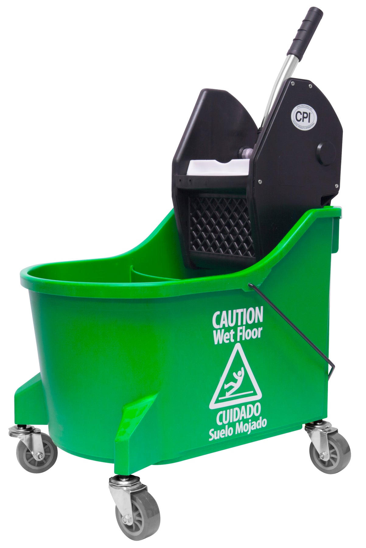 One-Piece divided bucket w/ 3" casters & downpress wringer, SS wringer handle, engineered material gears & pressure plate, handle holder. Rolled bucket lip for extra durability and wringer support ribbing/pour handle, metal bail/carry handle, extra wide footprint prevents tipping. Fits all size string/tube mops & TAB mops (with inlcuded wringer insert), Capacity: 5gal/19L Rinse & 4.5gal/17L Clean solution. - Color: Lime Green or Blue bucket with Black wringer